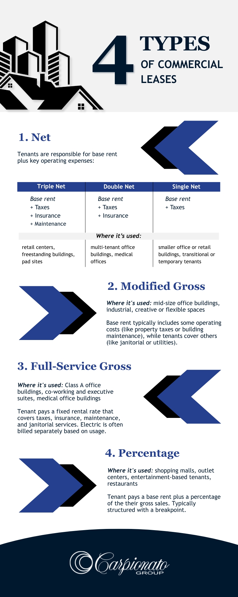 Below is an overview of the most common types of commercial leases offered across professionally managed retail, office, and mixed-use properties.